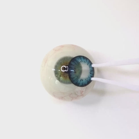 このレンズは鮮やかなブルーをベースとしています。レンズの外縁部分はより濃い青緑色、またはほぼブラックに近いダークブルーで表現されており、瞳の中心に向かうにつれて徐々に明るいスカイブルーへと変わるグラデーションとなっています。
