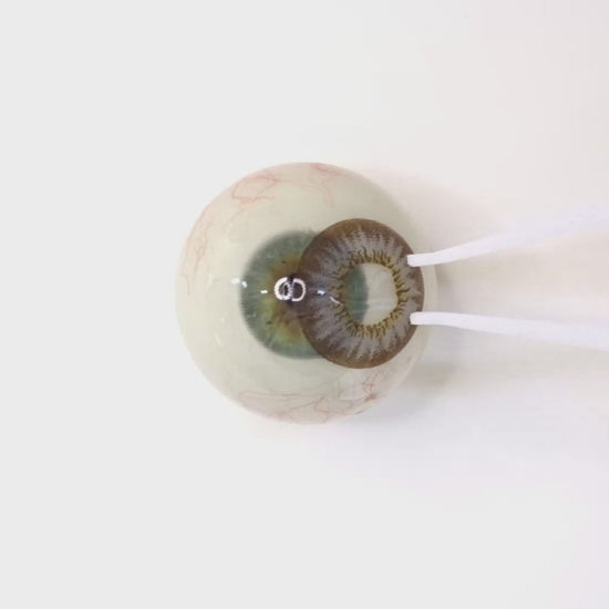 あたたかみのあるグレー系。中心部はゴールドイエローが太陽光のように広がり、外側に向かうほどグレーとチョコブラウンが自然に混ざり合い、深みのある仕上がりとなっています。瞳孔まわりのイエローがかった模様が、目元に生き生きとした印象を与えます。写真や照明下で光を受けたときにきらっと輝いて見える効果が期待できます。ヘーゼルブラウンの放射状デザインが元の瞳色になじみ、自然な印象を演出します。