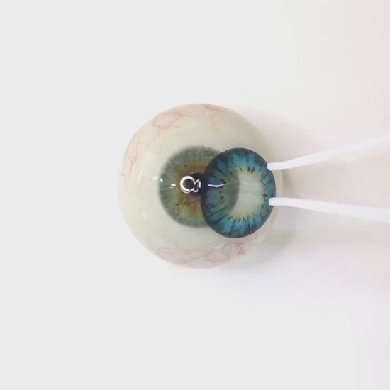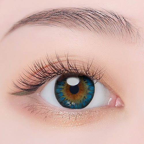 このレンズはブルーとグリーン系が混ざり合った、神秘的なカラーが特徴です。レンズの内側は淡いイエローで、外側に向かうほどブルーグリーンやスカイブルーが混ざった青系へと変化します。